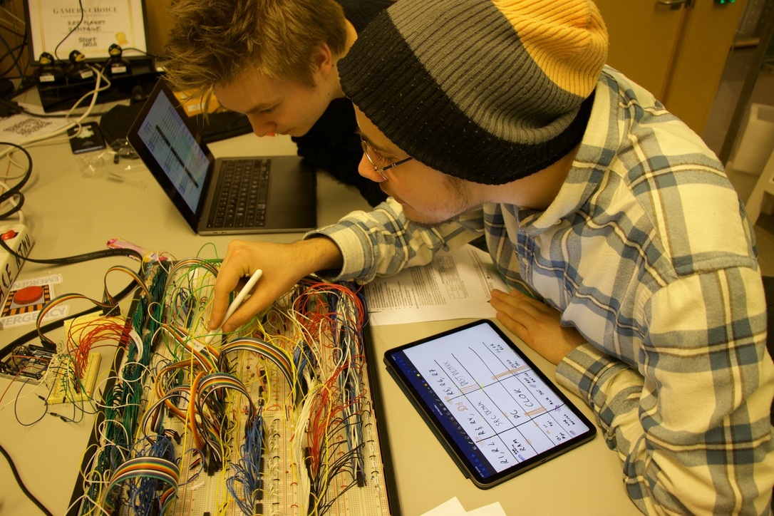 Hei fra Hackerspace sin fortsatt kuleste og mest kreative prosjektgruppe, Breadboard Computer. Sist vi skrev en artikkel satt vi kun med registerbanken ferdig. Nå har vi gjort ferdig eller nesten ferdig ALU, Kontrollenhet, RAM, “adresseregistre og shit” -frederik, konstante registre og flagg. Vi er ikke veldig glad i å fullføre ting, ettersom vi aldri tester det vi lager. Så et par av gangene vi har sett tilbake på noe vi har laget, har det som regel ikke fungert. Heldigvis har Frederik, vår nye diktator, brukt sitt jerngrep til å få orden i sakene. Nå er vi alle tvunget (med vold, hjelp!) til å dokumentere hva som er laget ferdig, hvor det er plassert på CPUen, og om det er testet før vi får lov til å begynne på noe nytt. Vi undersåtter tror dette er på grunn av den gangen Frederik dro opp en ledning fra CPUen og plugga den i et random hull igjen, i håp om at ingen skulle oppdage det. Men det har vi ikke lov til å snakke om :MonkaS: